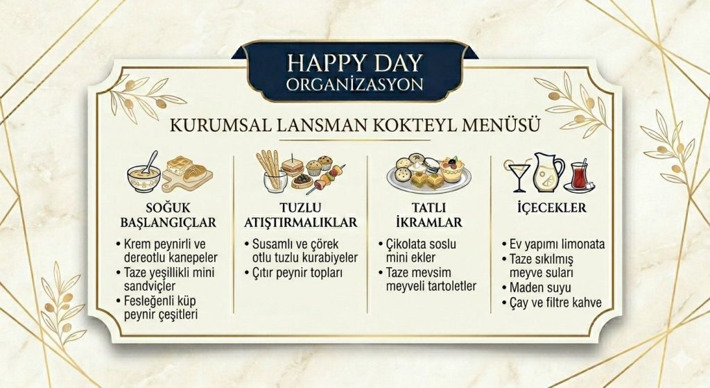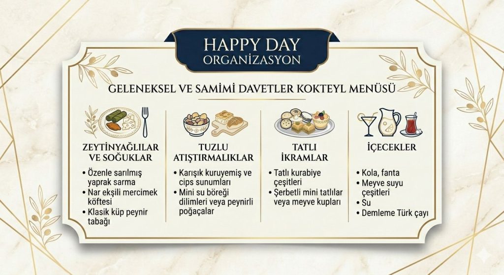 - Zamanlama: Kokteylin akışını planlayın (açılış, ikramlar, müzik, eğlence).
